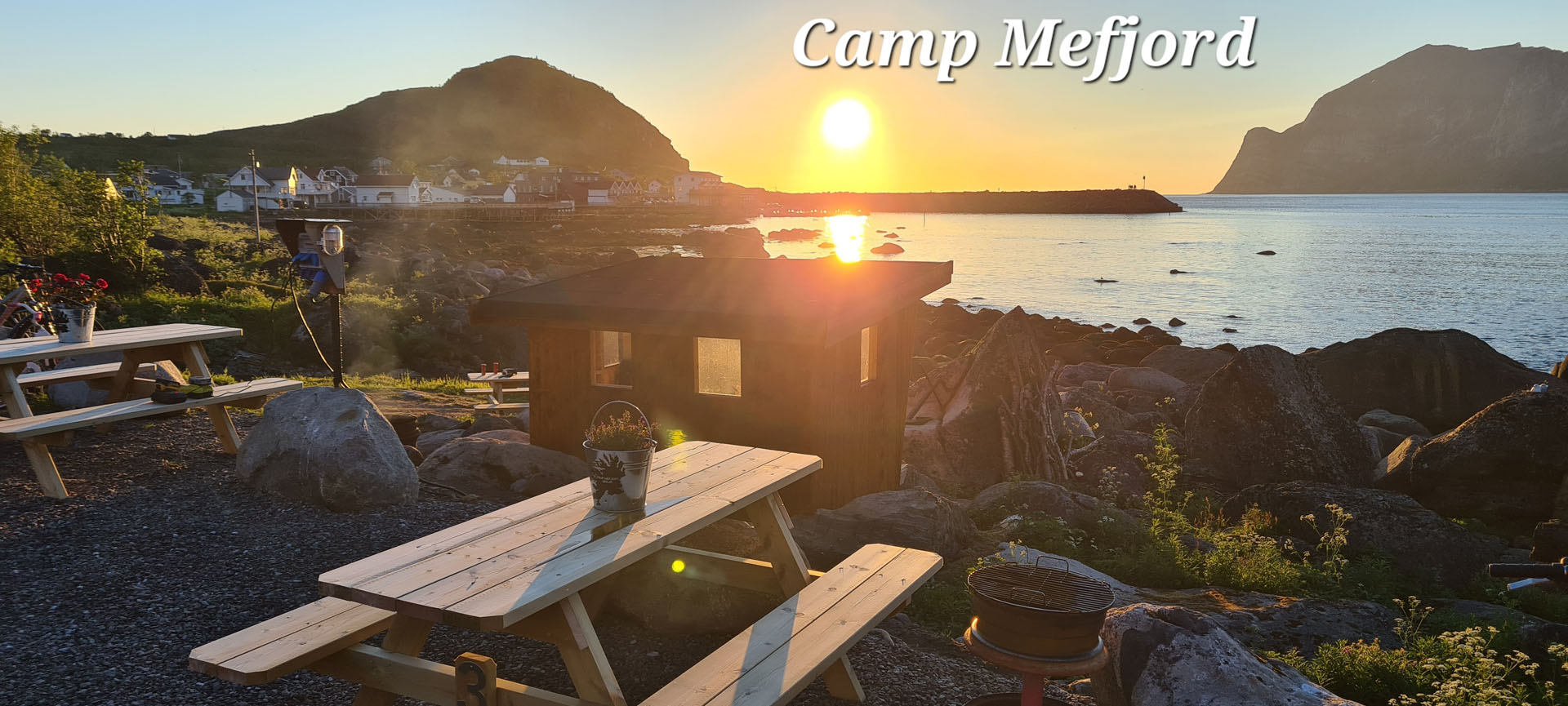 Camp Mefjord ligger nede ved sjøen, mellom fjell og fjord i Mefjordvær på Senja.